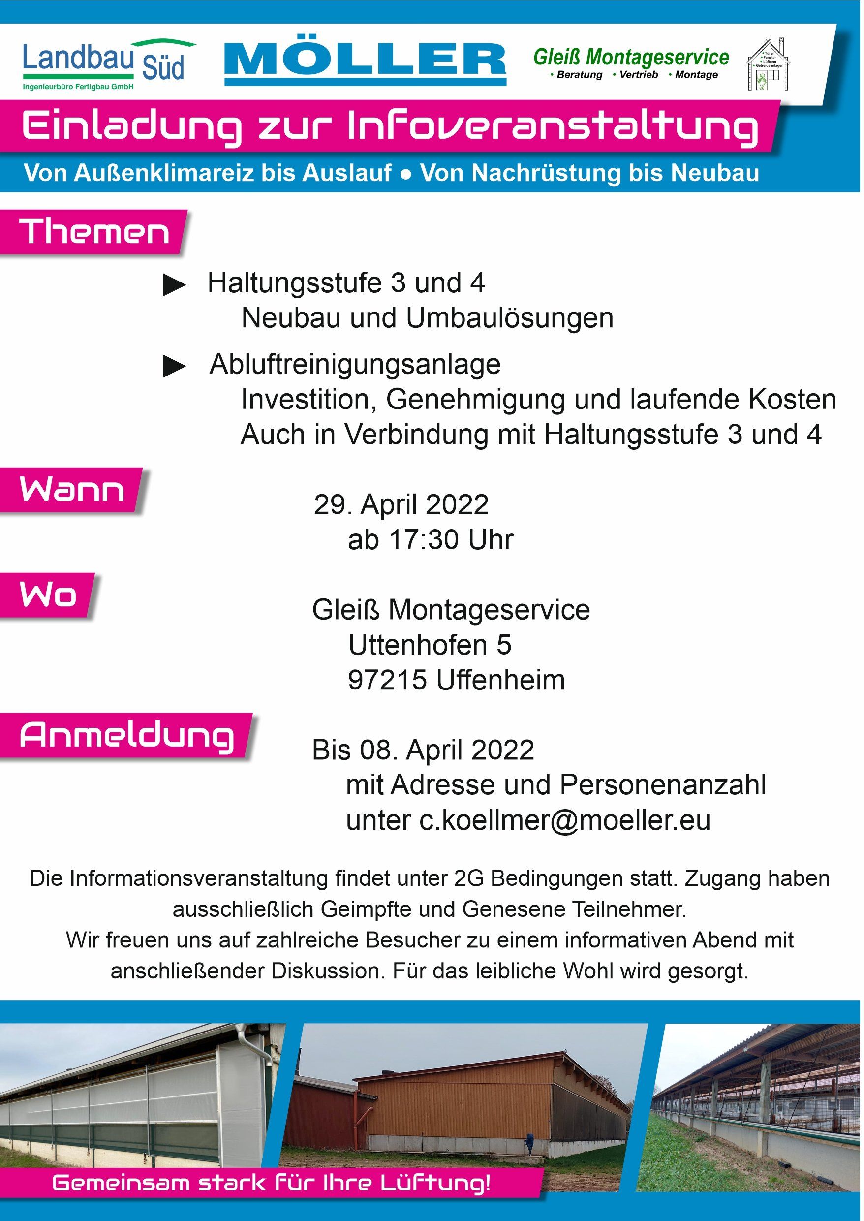 Am 29. April 2022 laden wir Sie gemeinsam mit unseren langjährigen Partnern herzlich zur Informationveranstaltung ein. Wir freuen uns, Ihnen an diesem Abend Ihre Möglichkeiten mit den Haltungsstufen 3 und 4 aufzuzeigen und wie dies auch im Zusammenspiel mit einer Abluftreinigungsanlage funktioniert.