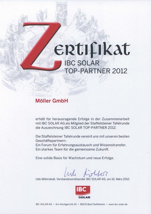 Every year they are elected, the best and best-selling partners of IBC Solar AG. IBC has been on the photovoltaic market for over 20 years. In the north of Franconia, right next to the Banz Monastery near Bad Staffelstein, IBC has made a name for itself in the solar market worldwide. A small company has now become a global and international corporation. Take a look at the certificate.